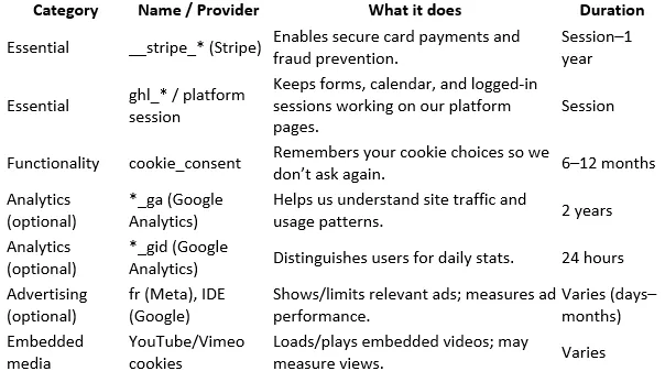 Essential (strictly necessary) – keep pages/forms working; secure login; load calendar/checkout.